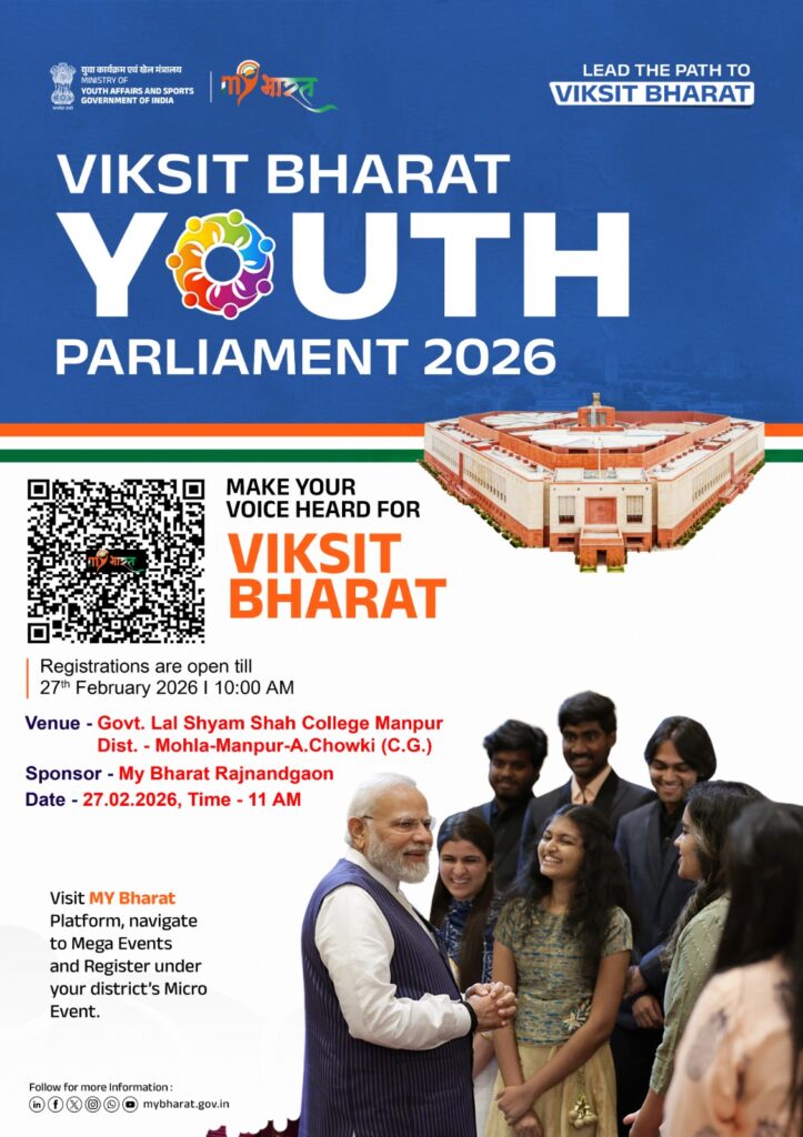 मानपुर। प्रधानमंत्री श्री नरेंद्र मोदी के ‘विकसित भारत 2047’ के विजन को साकार करने और युवाओं में नेतृत्व क्षमता व नागरिक सहभागिता विकसित करने के उद्देश्य से जिले में ‘विकसित भारत यूथ पार्लियामेंट 2026’ का आयोजन किया जा रहा है। जिला स्तरीय यह प्रतियोगिता आज, 27 फरवरी 2026 को सुबह 11:00 बजे से शासकीय लाल श्याम शाह महाविद्यालय, मानपुर में आयोजित की जाएगी। इस प्रतियोगिता का मुख्य विषय “आपातकाल के 50 वर्ष: भारतीय लोकतंत्र के लिए सीख” रखा गया है। कार्यक्रम में शामिल होने वाले प्रतिभागियों को इस गंभीर और ऐतिहासिक विषय पर 3 मिनट के भीतर अपना ओजस्वी वक्तव्य प्रस्तुत करना होगा। माय भारत (My Bharat) राजनांदगांव और एनएसएस (NSS) के सहयोग से आयोजित इस स्पर्धा में जिले भर के 18 से 25 वर्ष के युवा हिस्सा ले रहे हैं। जिला स्तर पर उत्कृष्ट प्रदर्शन करने वाले शीर्ष 10 प्रतिभागियों का चयन राज्य स्तरीय प्रतियोगिता के लिए किया जाएगा। आयोजकों ने बताया कि इच्छुक युवा आज 27 फरवरी 2026 को सुबह 10:00 बजे तक अपना ऑनलाइन पंजीकरण करा सकते हैं। इसके लिए युवाओं को ‘My Bharat’ पोर्टल पर जाकर ‘Mega Events’ विकल्प में अपने जिले के ‘Micro Event’ के तहत रजिस्टर करना होगा।